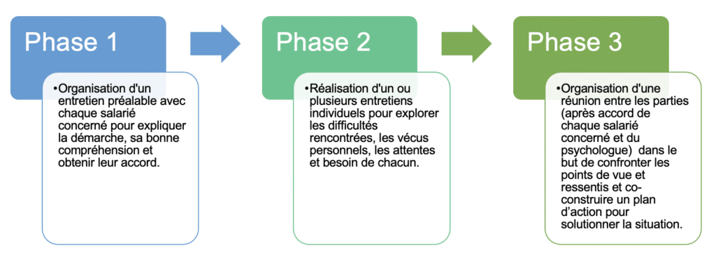 Dans certains conflits, le recours à un psychologue du travail, externe à l’entreprise, est parfois nécessaire pour résoudre la situation. Avec une posture de neutralité bienveillante, doté d’outils spécifiques et maitrisant les techniques d’entretien, le psychologue pourra accompagner les collaborateurs à améliorer leur relation.